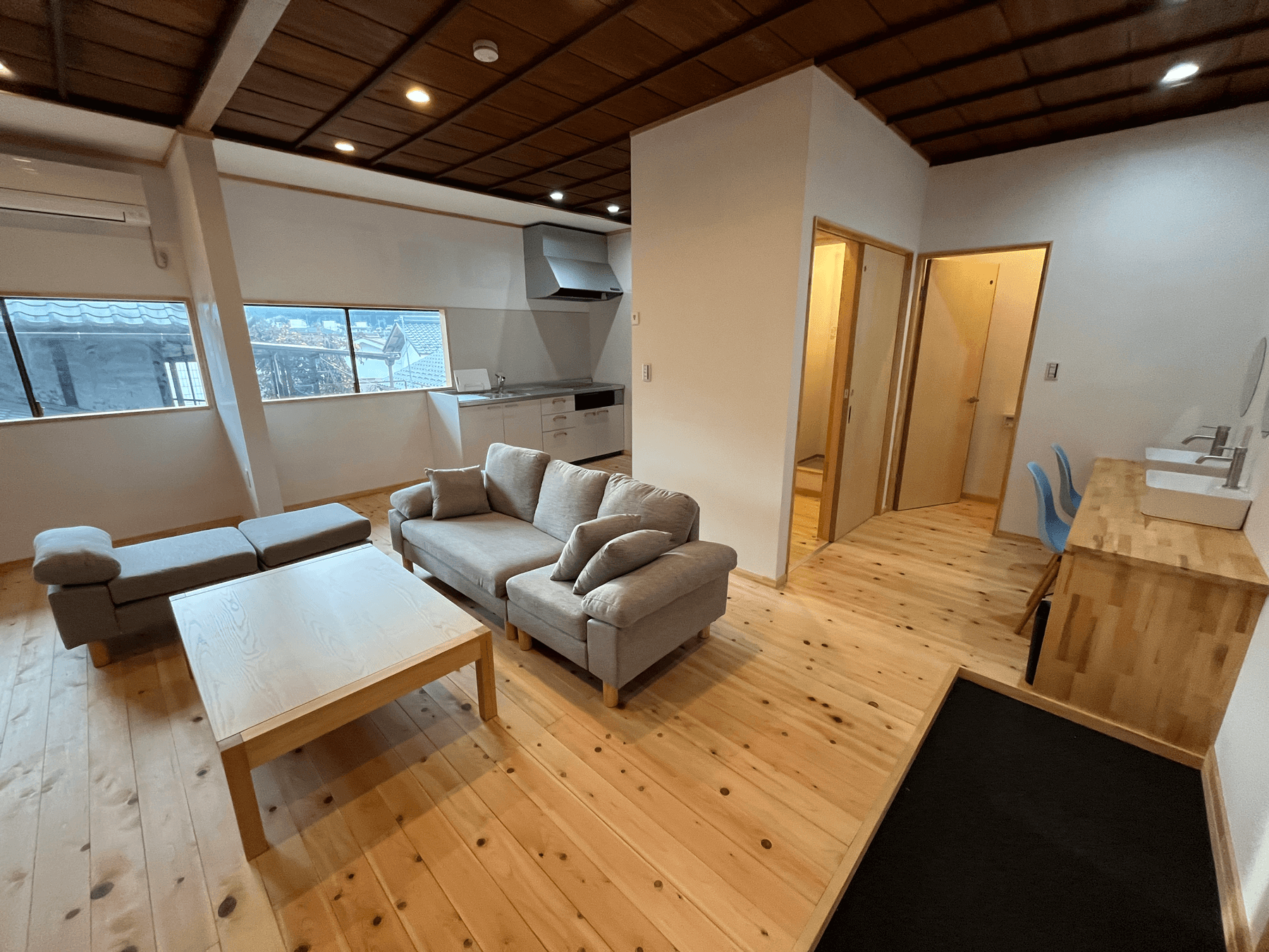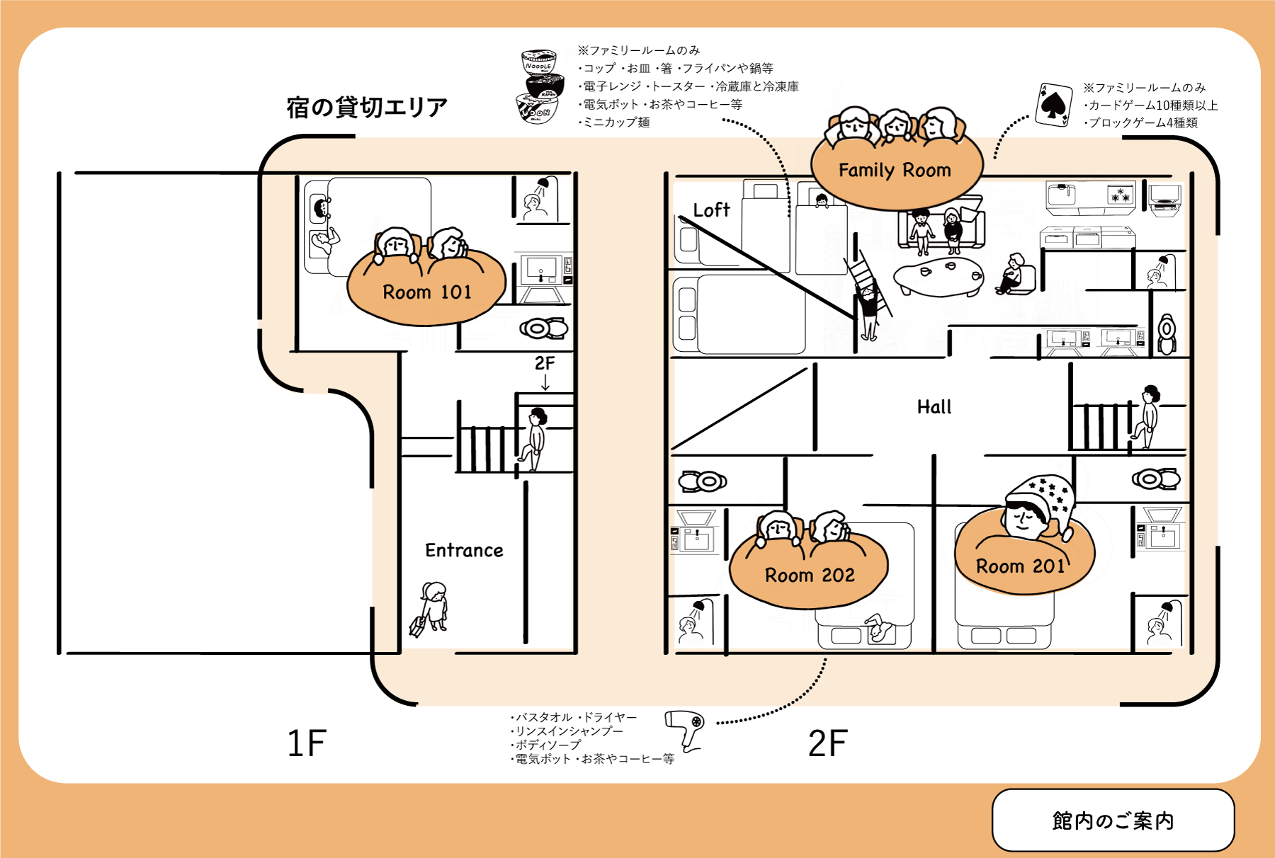 ホテルタイプの古民家宿にはダブルルームが3部屋、ファミリールームが1部屋ございます。2人でダブルルームでまったりと。ファミリールームにはゲームや小腹を満たすミニカップ麺もご用意しています。ぜひ宿での時間を皆様でお楽しみください。